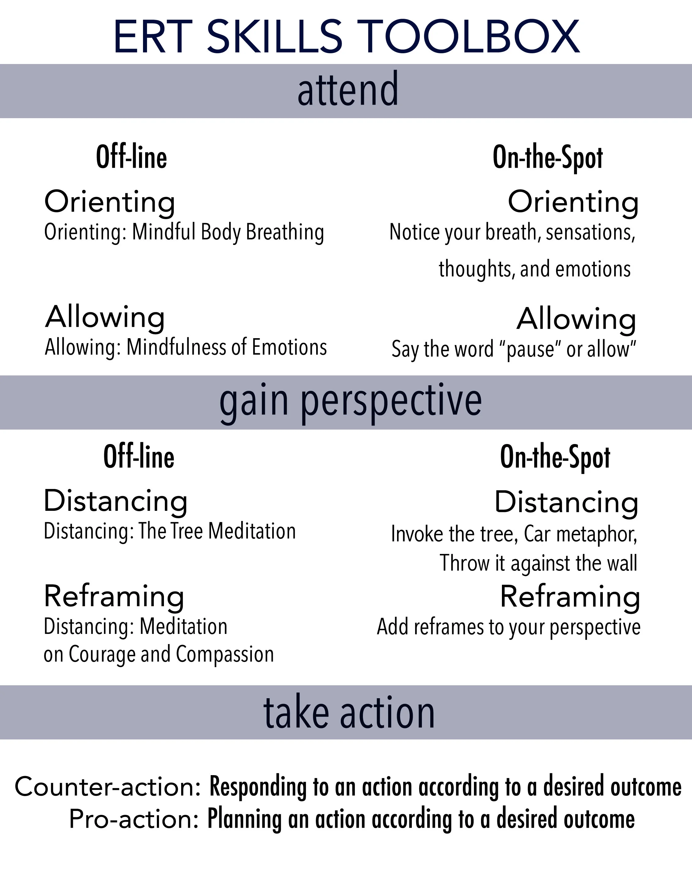 You have now been taught the four regulation skills we use in ERT—orienting, allowing, distancing, and reframing. We teach these mindful regulation skills in this sequence because they come in order of least elaborative to most elaborative. We encourage you to use them in the order we introduced them in hopes that the early, less elaborative skills will be sufficient to restore clarity for action, but that the more elaborative skills remain available if needed. Use as many skills as necessary, in order, to gain clarity for action.